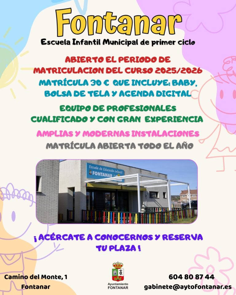 El Ayuntamiento de Fontanar ha anunciado la apertura del periodo de matrícula para la Escuela Infantil Municipal para el curso 2025-2026. Situada en la Camino del Monte nº1, la escuela ofrece un servicio educativo y de cuidado para los más pequeños, con tarifas adaptadas a las necesidades de las familias.