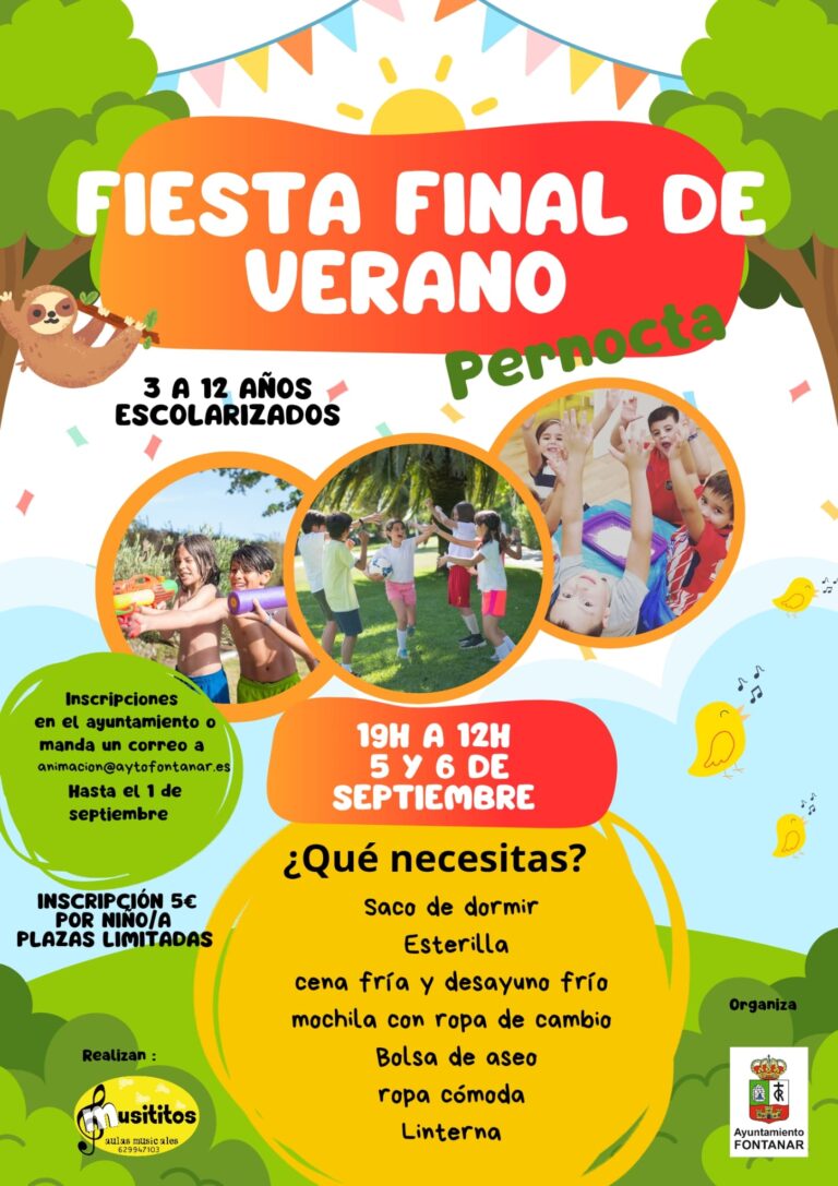 El Ayuntamiento de Fontanar organiza una Fiesta Final de Verano dirigida a niรฑos y niรฑas de 3 a 12 aรฑos. El evento, que requiere de inscripciรณn previa hasta este miรฉrcoles dรญa 3, se celebrarรก en la ludoteca municipal Tronchilandia los dรญas 5 y 6 de septiembre, en horario de 19:00 horas del viernes hasta las 12:00 horas del sรกbado.