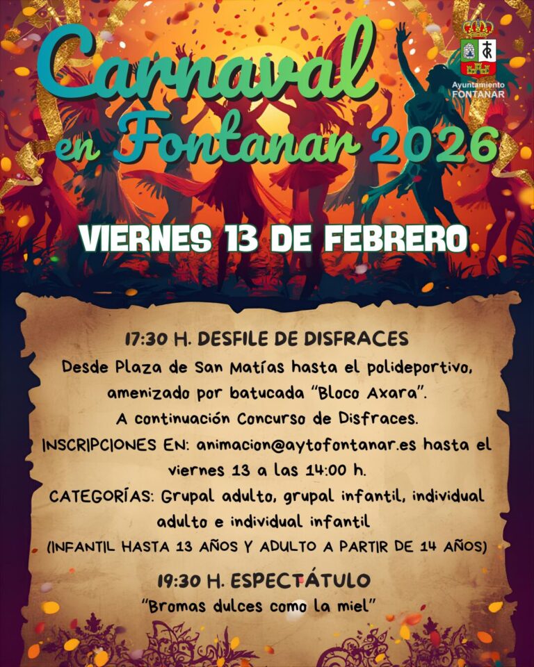 El próximo viernes 13 de febrero, Fontanar se vestirá de fiesta para celebrar una nueva edición de su Carnaval. La jornada comenzará a las 17:30 horas con un Desfile de Disfraces que recorrerá desde la Plaza de San Matías hasta el polideportivo municipal, animado por el ritmo de la batucada “Bloco Axara”. A continuación, tendrá lugar el tradicional Concurso de Disfraces, con categorías grupal e individual, tanto para adultos como para niños. Las inscripciones pueden realizarse en el correo electrónico animacion@aytofontanar.es hasta el 13 de febrero a las 14:00 h.