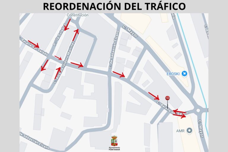 El Ayuntamiento de Fontanar ha puesto en marcha una reorganizaci贸n de la circulaci贸n en tres v铆as del municipio con el objetivo de mejorar la fluidez del tr谩fico y la seguridad vial. La medida afecta desde hoy al Paseo de la Soledad, la calle Batalla del Salado y la calle Alcalde Isidoro Mart铆nez, donde ya se ha instalado nueva se帽alizaci贸n vertical para guiar a los conductores. Los cambios entrar谩n en vigor hoy a las 15:00 h.
