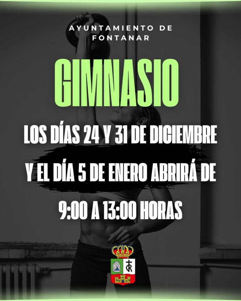 El gimnasio municipal de Fontanar ha hecho pรบblico su calendario de apertura para el periodo navideรฑo. Los dรญas de Nochebuena, Nochevieja y la tarde de Reyes (24 y 31 de diciembre y 5 de enero), las instalaciones permanecerรกn abiertas en horario de maรฑana, concretamente de 9:00 a 13:00 horas. Se recomienda a los usuarios planificar sus visitas en este horario reducido.