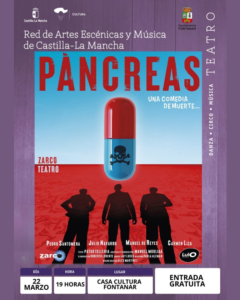 El prรณximo domingo 22 de marzo, a las 19:00 horas, la Casa de la Cultura de Fontanar acoge la representaciรณn de Pรกncreas. Una comedia de muerte…, una obra de la compaรฑรญa Lulo Producciones que promete hacer reรญr al pรบblico a partir de un tema tan universal como inevitable: el final de la vida.
