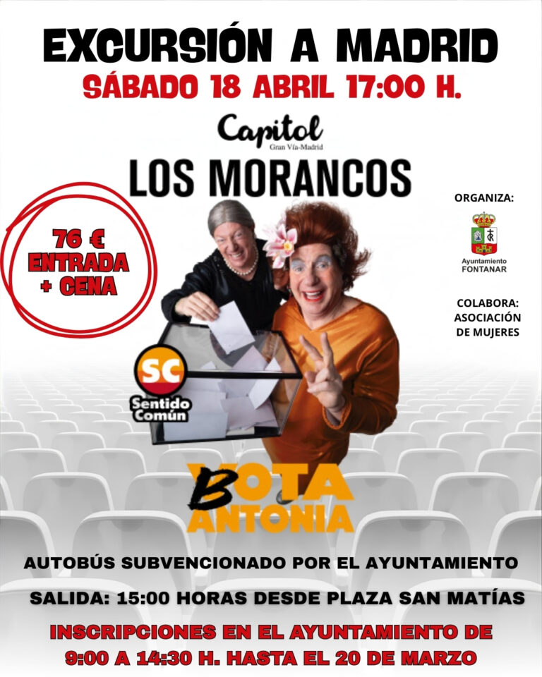 El sรกbado 18 de abril, los amantes del humor tienen una cita ineludible en Madrid. El Ayuntamiento, en colaboraciรณn con la Asociaciรณn de Mujeres, ha organizado una excursiรณn para asistir al espectรกculo de Los Morancos, ยซBota Antoniaยป, que tendrรก lugar en el emblemรกtico teatro Capitol de la Gran Vรญa a partir de las 17:00 horas. La iniciativa busca acercar la cultura y el entretenimiento a los vecinos, ofreciendo un plan completo que incluye transporte, cena y entrada por un precio de 76 euros. Gracias a la subvenciรณn municipal, el autobรบs serรก gratuito para los participantes, saliendo a las 15:00 horas desde la Plaza San Matรญas.