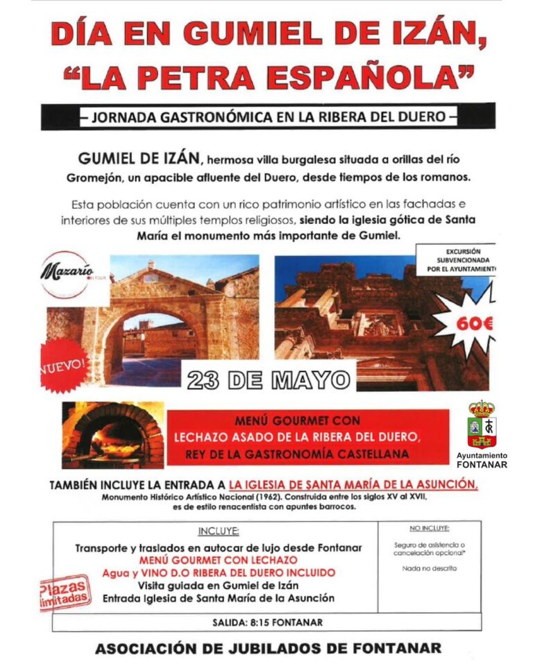 La Asociaciรณn de Jubilados de Fontanar ha organizado un viaje cultural a la localidad burgalesa de Gumiel de Izรกn, una actividad que combinarรก el patrimonio histรณrico con la alta gastronomรญa. Durante la jornada, los participantes podrรกn visitar la iglesia del municipio y disfrutar de una visita guiada por el casco histรณrico, antes de degustar un menรบ gourmet basado en el tradicional lechazo asado. El precio del viaje es de 60 euros e incluye el desplazamiento, las visitas y la comida.