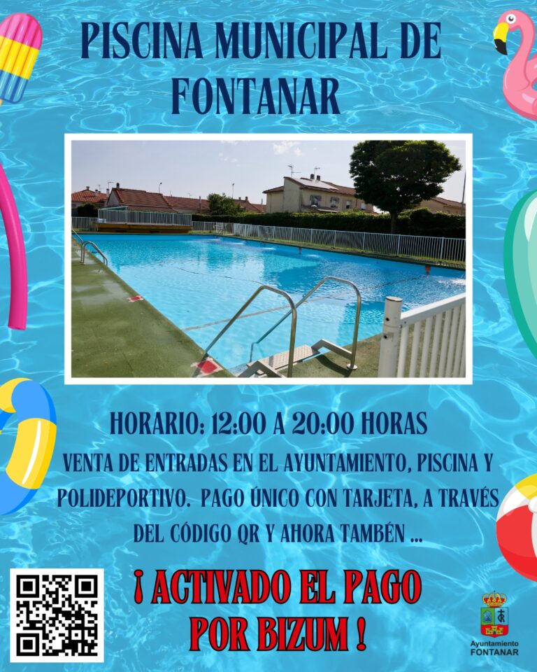 La piscina municipal de Fontanar, que abri贸 sus puertas el pasado jueves, ha incorporado una novedad para facilitar el acceso a sus instalaciones. Ahora, adem谩s de pagar con tarjeta en taquilla o a trav茅s del enlace: https://fontanar.es/pagos-servicios-municipales/ los usuarios podr谩n abonar su entrada mediante Bizum, agilizando as铆 el proceso.