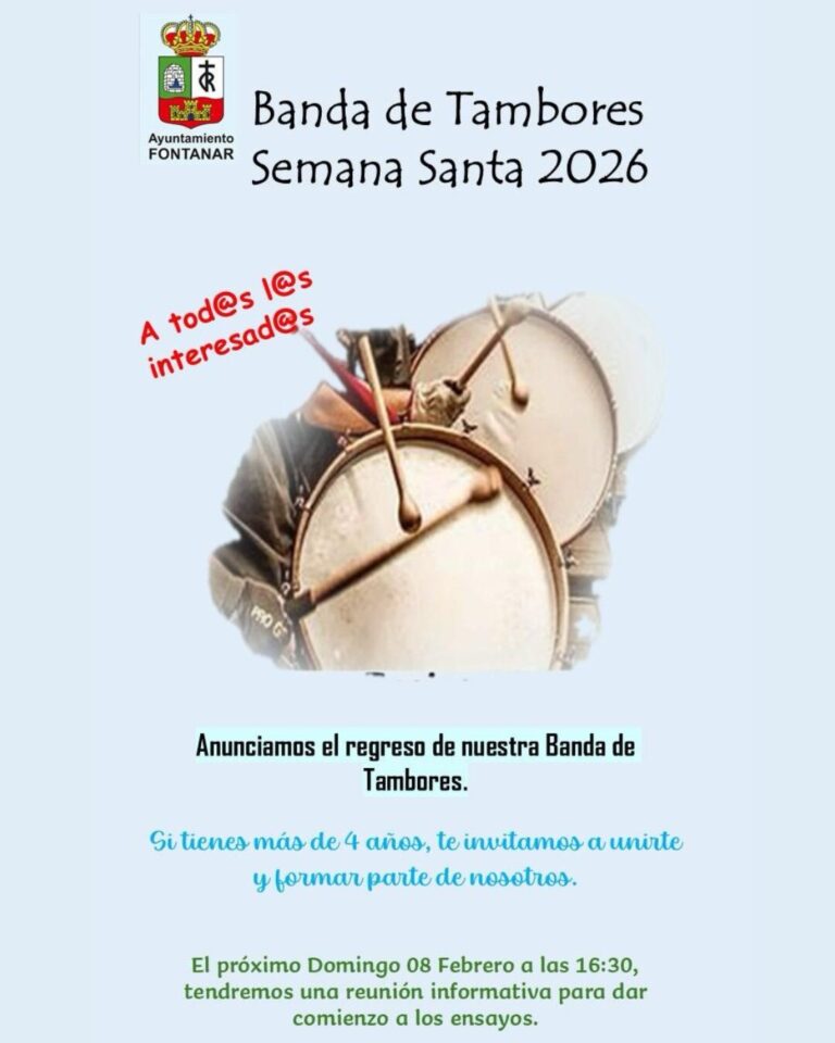 La Banda de Tambores anuncia su regreso con miras a la Semana Santa 2026, extendiendo una invitaci贸n abierta a todas las personas interesadas en formar parte de esta tradici贸n. La convocatoria est谩 dirigida a quienes tengan m谩s de 4 a帽os de edad, con el objetivo de integrar nuevas generaciones y fortalecer la participaci贸n en esta expresi贸n cultural y religiosa.