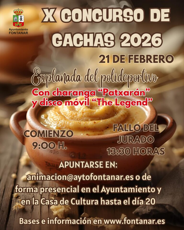 El próximo 21 de febrero, Fontanar vivirá una jornada gastronómica y festiva con la celebración de la décima edición de su tradicional Concurso de Gachas. El evento, que consolida su aniversario con una década de existencia, contará con el animado ambiente de la charanga “Patxarán” y disco móvil “The Legend”, asegurando una atmósfera lúdica y participativa para todos los asistentes.