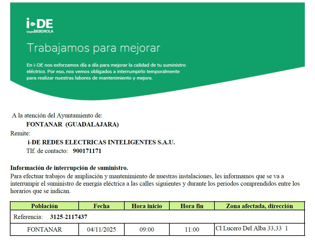 El próximo martes, 4 de noviembre, los vecinos de la calle Lucero del Alba se verán afectados por una interrupción