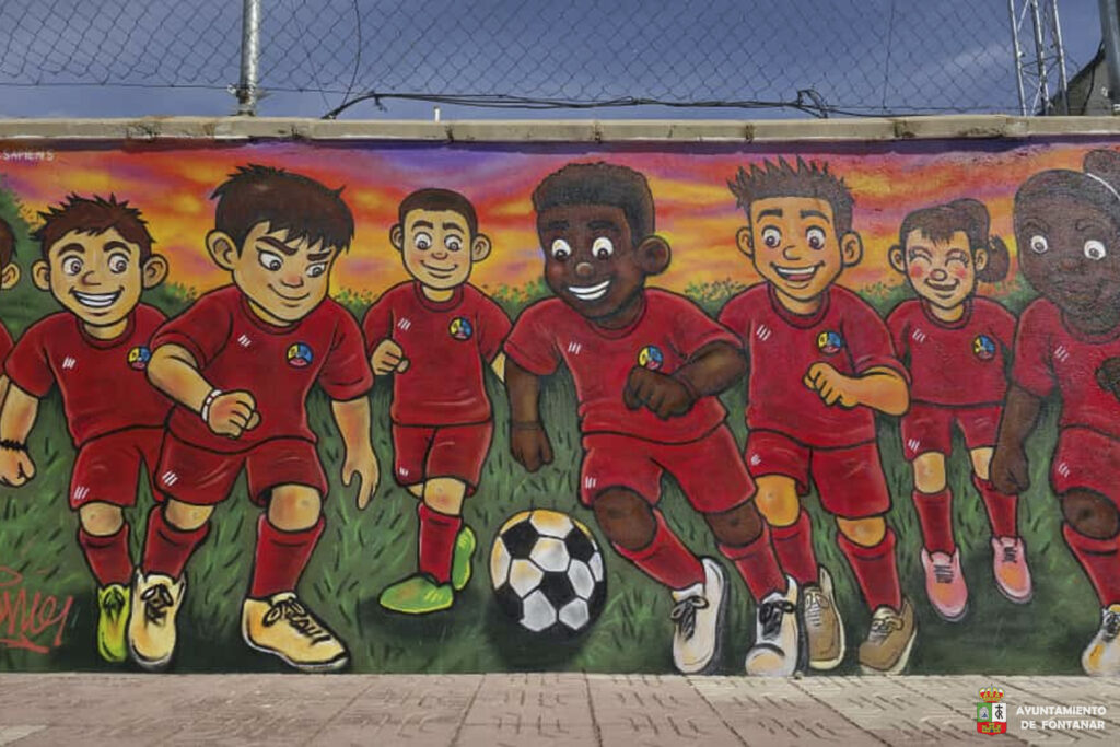 El mural del autor Crono Sapiens, que decora la pared del campo de fútbol El Palacio con una representación de