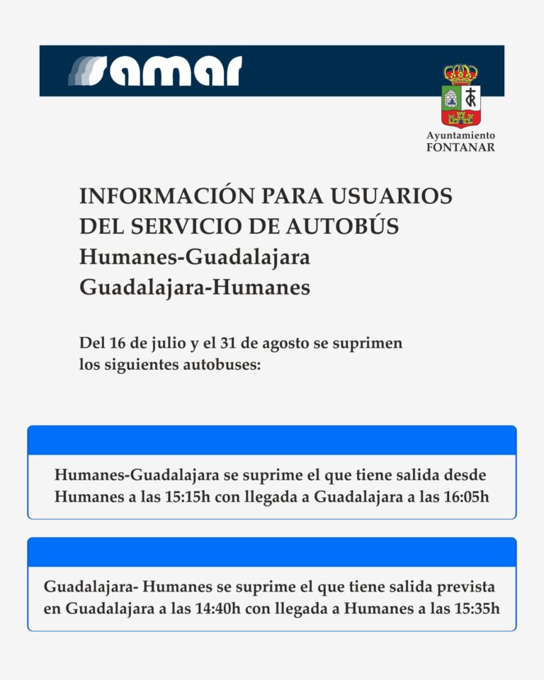 El Servicio de Transportes de la Junta de Comunidades de Castilla-La Mancha ha informado que, durante el verano, se suspenderán dos viajes diarios de la línea VCM-001 (Humanes – Guadalajara).